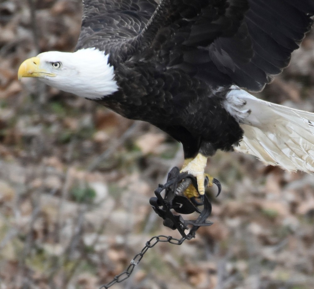 Voluntários tentam localizar águia com armadilha presa na garra nos EUA