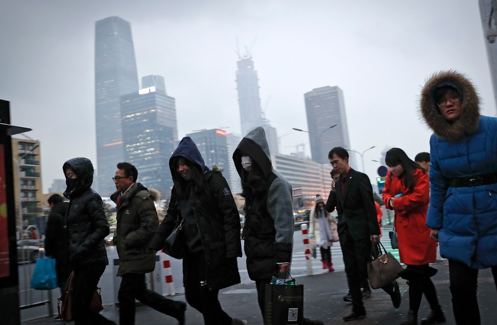 Foto de 21 de fevereiro de 2017 mostra moradores de Pequim caminhando em direção a uma estação de metrô, sob céu cinzento de poluição (Foto: AP Photo/Andy Wong)