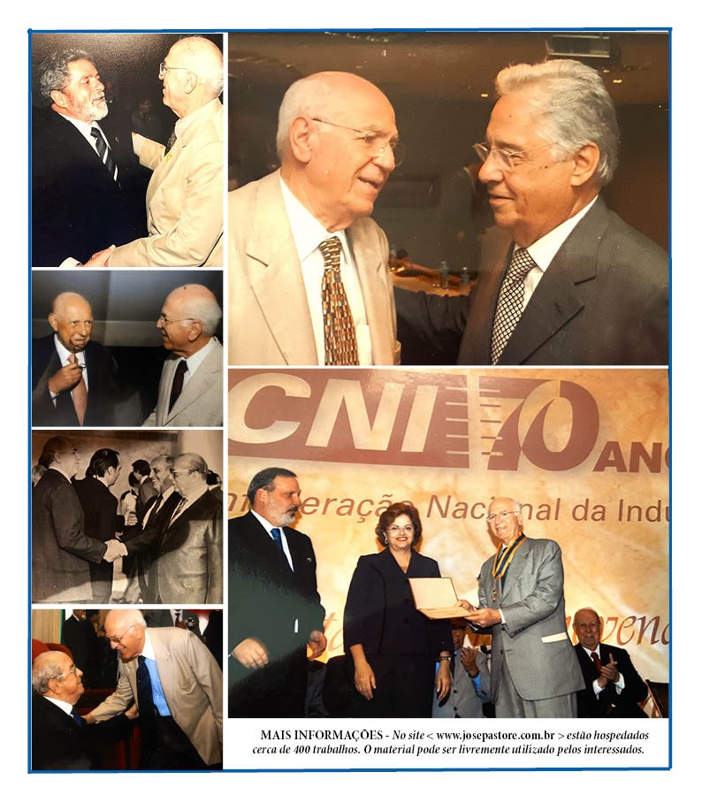 O professor e sociólogo JOSÉ PASTORE toca seus estudos sobre capital humano com o mesmo entusiasmo com que toca seu instrumento preferido: o violino. Especializado nas áreas da Educação, Trabalho e Recursos Humanos, Pastore sempre é acionado por autoridades e entidades de classe para consultas e conselhos. Nas fotos, José Pastore está com os ex-presidentes João Figueiredo, FHC, Lula, Dilma Rousseff e, ainda, com o ex-ministros Jarbas Passarinho e José de Alencar. José Pastore também recebe do ex-presidente da CNI, Armando Monteiro, e de Dilma Rousseff a Comenda-Homenagem pelos 70 anos da Confederação Nacional da Indústria. Pastore já recebeu inúmeras medalhas, entre elas “Ordem do Mérito da Justiça do Trabalho” e “Ordem do Rio Branco”.