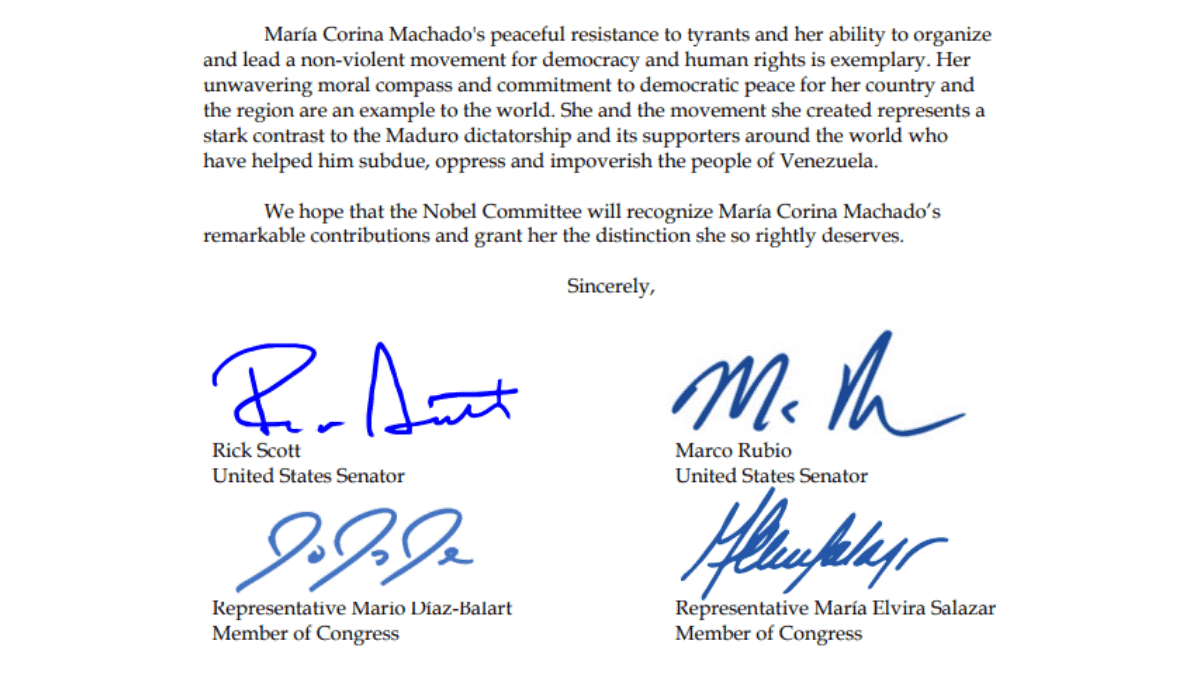 Maria Corina Machado teve sua indicação formalizada para o Prêmio Nobel da Paz em agosto de 2024, quando Marco Rubio, então senador pela Flórida, enviou uma carta ao Comitê Norueguês do Nobel. O documento foi assinado por outros parlamentares republicanos, incluindo o senador Rick Scott e os deputados Mario Díaz-Balart, María Elvira Salazar, Michael Waltz, Neal Dunn, Byron Donalds e Carlos Gimenez.