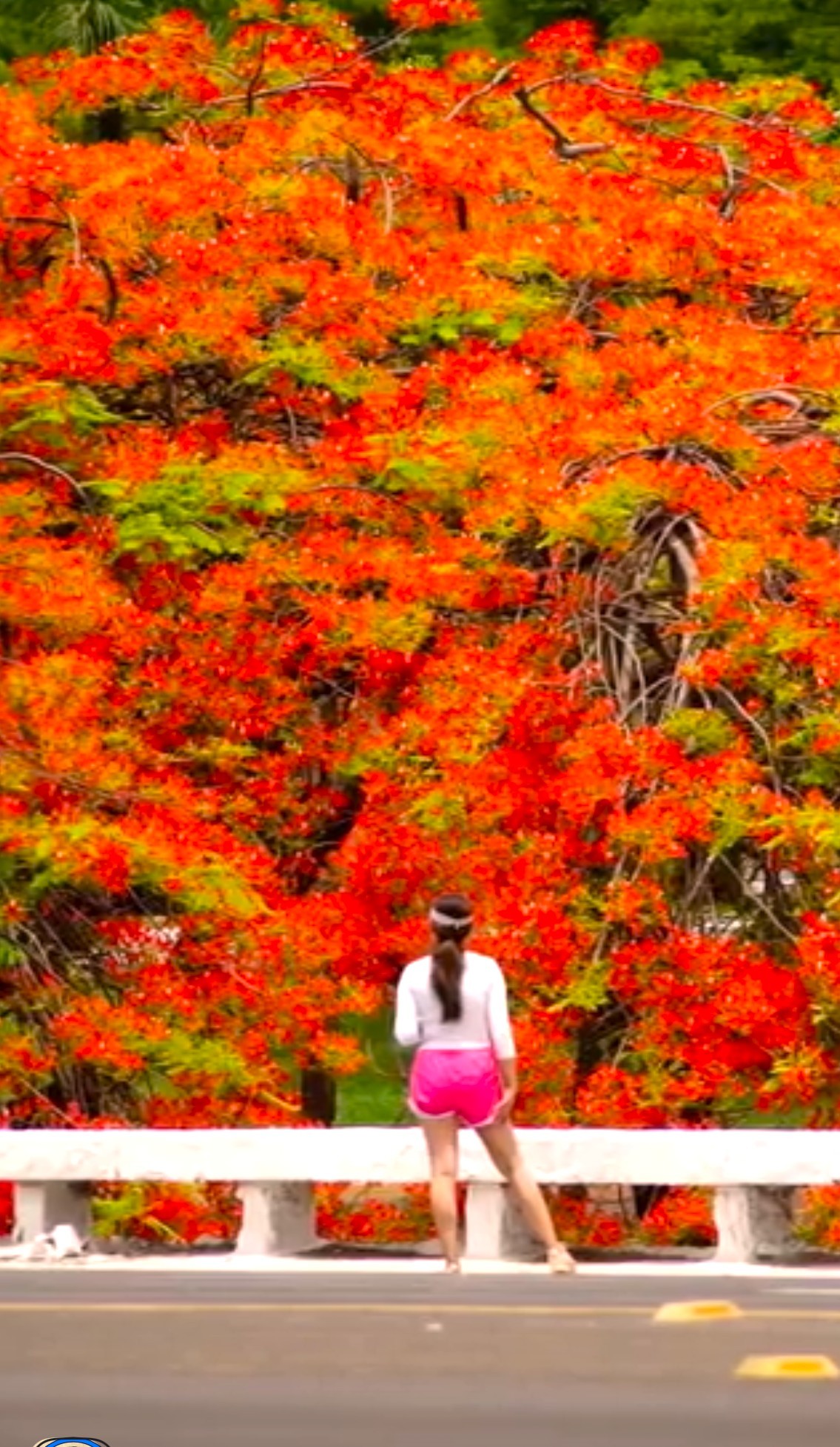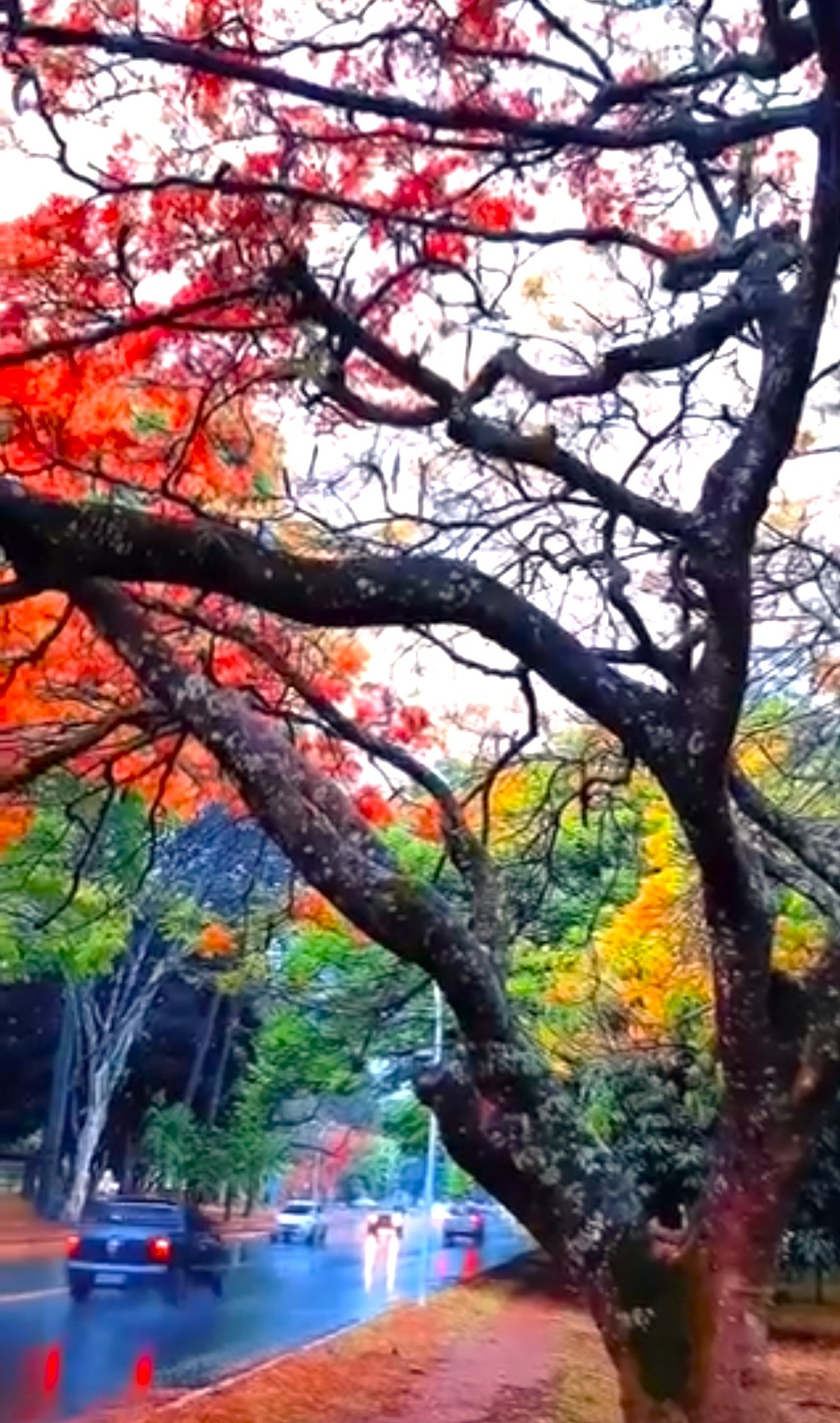 No final de ano, os Flamboyants se misturam às Aroeira-vermelha, sibipirunas e cambuís e cobrem, como um arco-íris, os eixos e eixinhos da Brasília.