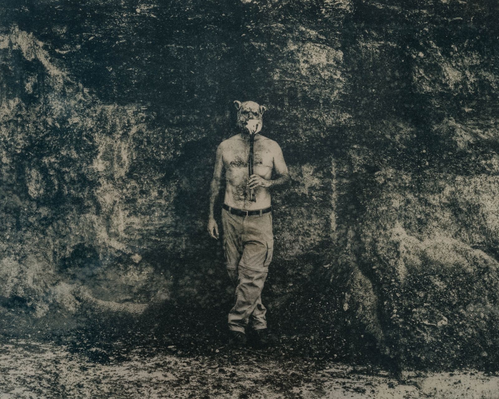 ORIGENS, um de seus trabalhos, inicia-se com uma fotografia (cianótipos) intitulada “Autorretrato”, apresentando um ser híbrido, parte homem, parte animal (com uma flor?), que parece emergir, ereto, das sombrias paredes rochosas do interior de uma mina. Seus pés, cravados nos desmoronados de rochas no chão, dão a impressão de flutuar no espaço; seu corpo claro, em contraste com o escuro do ambiente, desprega-se do restante da imagem, como se projetado no ar.