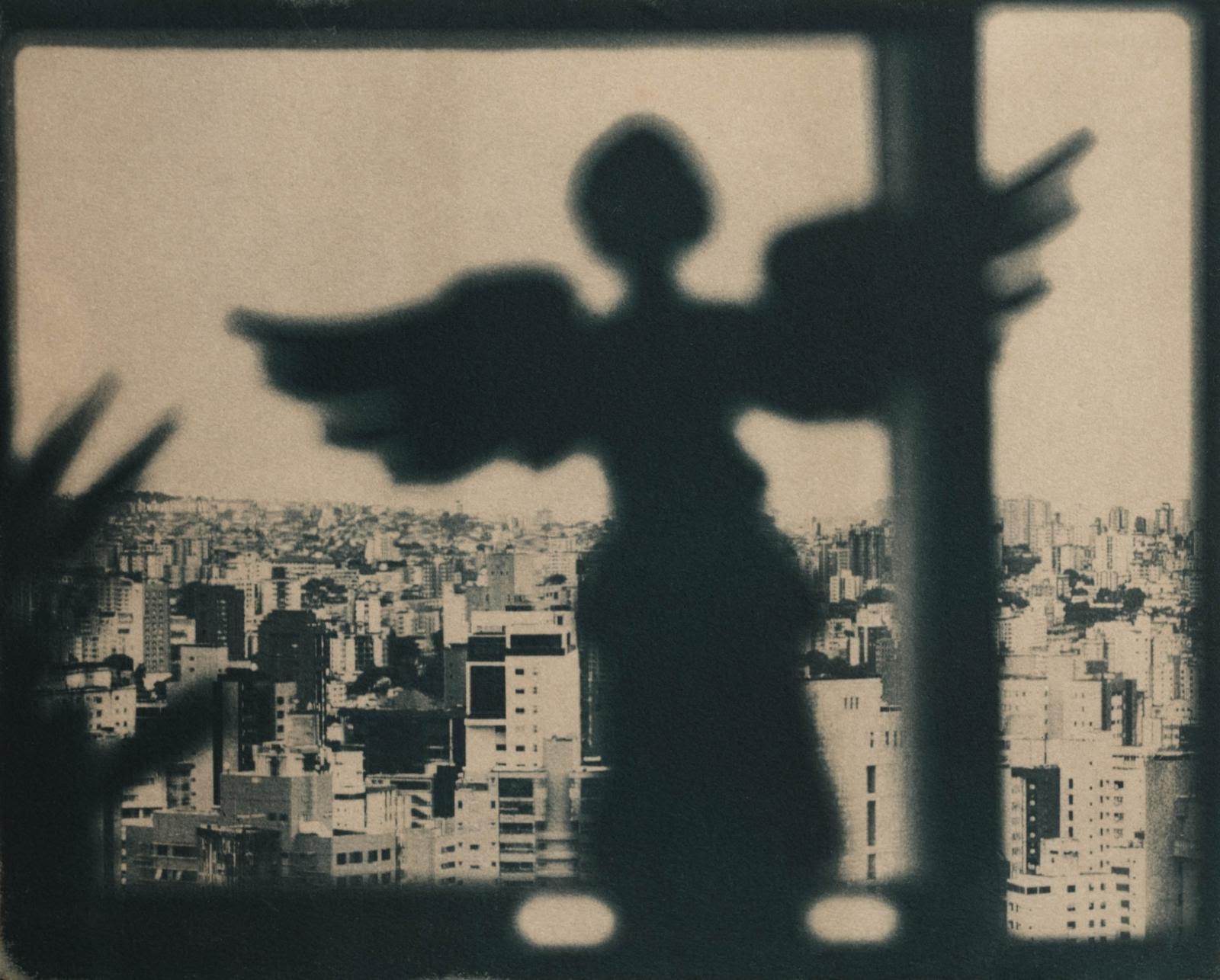 A foto de um anjo de asas abertas, silhueta desfocada, tendo ao fundo a cidade de Beagá.