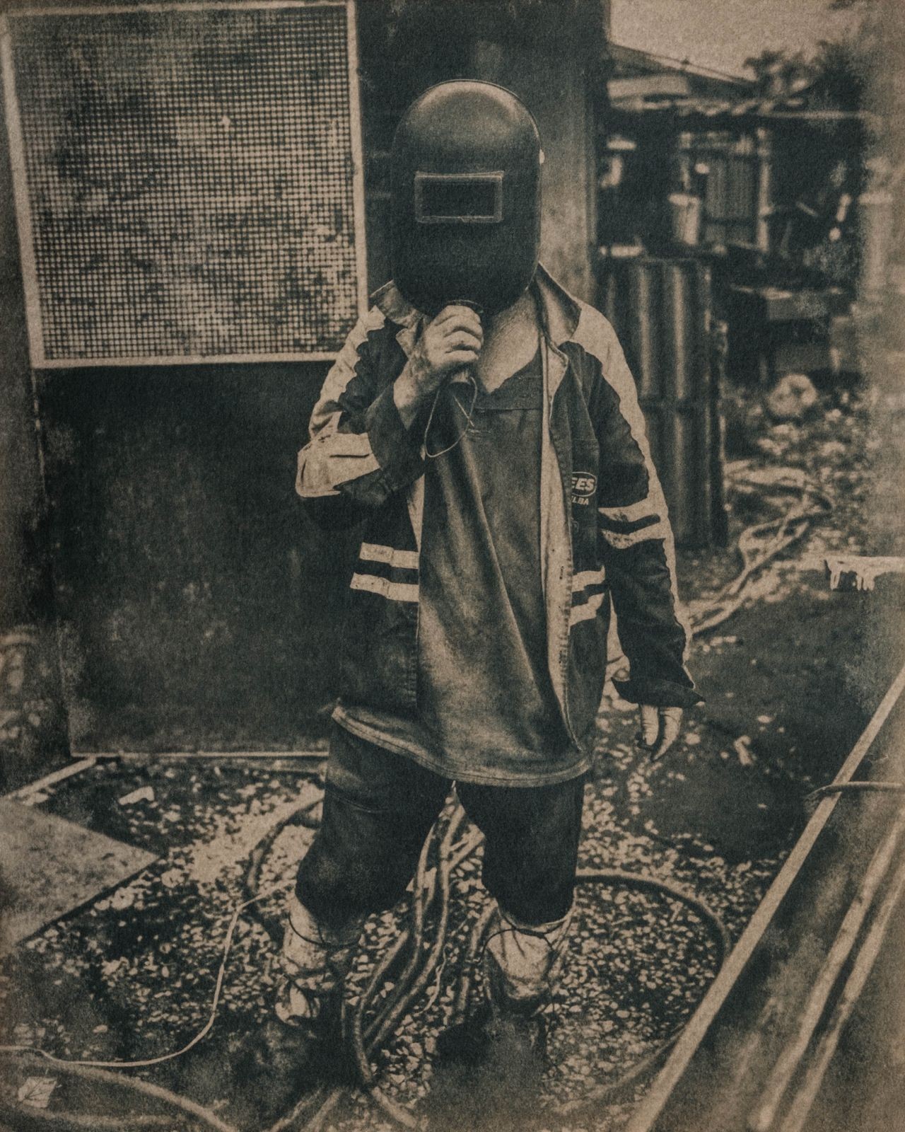 Trabalhador nas siderurgias trabalhando mascarado para se proteger da poluição.