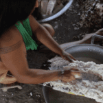 Povos indígenas foram fundamentais para a geração da diversidade que atualmente encontramos na mandioca. Na foto acima, agricultora rala raízes de mandioca para consumo. A aldeia mantém variedades para diferentes propósitos, como produção de farinha e consumo in natura. Além de plantas mais resistentes à seca e a doenças.